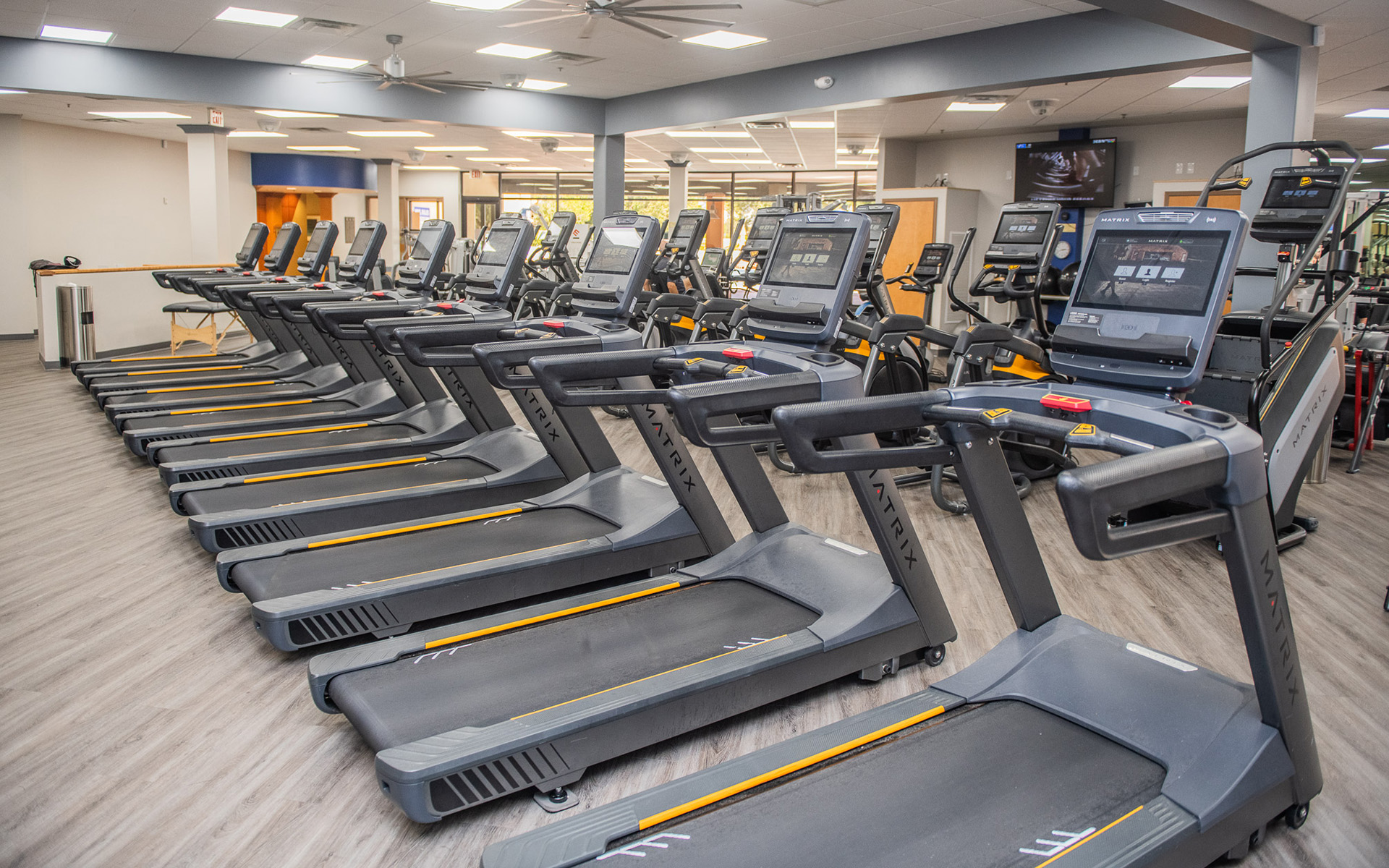 • State-of-the-art equipment to include: Matrix treadmills, upright and recumbent bicycles, Ellipticals, Step Mill, Techno Gym resistant weight machines, Squat Rack Platform, free weight benches, plates & bells